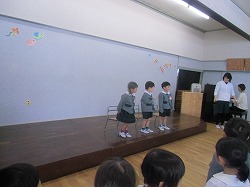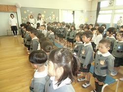 4、5歳児はホールに集まり、くま組の新しい3人のお友達の紹介を聞いたり、歌のプレゼントをしたりしました。