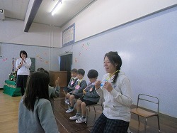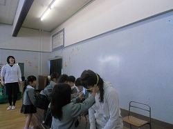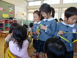 その後、年長児はそれぞれ年少児のクラスへ行き、年少のお友達と一緒に手遊びをして遊んだり、歌をうたったりしました。一人一人、ペンダントを首にかけてあげて、「ありがとう!」とお礼を言ってもらい、少し照れていた年長児の子どもたちでした。
