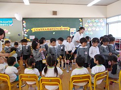 新しい教頭先生の話も聞き、最後には年長児から手作りのペンダントを渡し、舞台の上で緊張していた子どもたちも少し笑顔を見せてくれましたよ。