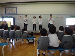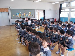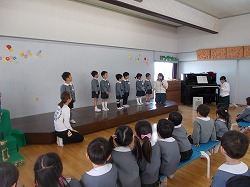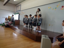 年中児・年長児のお友達がホールに集まって、4月から大住幼稚園に来てくれたお友達を紹介する新入園児歓迎会をしました。
