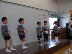 幼稚園のお友達から歌のプレゼントと、年長さんからは手作りのペンダントをもらった新入園児のお友達。これからみんなでたくさん遊ぼうね!
