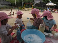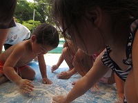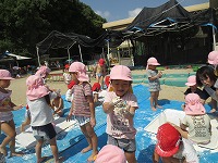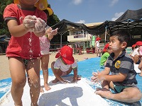 夏の日差しを元気いっぱいに浴びながら、泡や、小麦粉、片栗粉などの感触を全身で感じて遊んでいます。