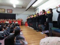 幼稚園では全園児がホールに集まり、ひなまつり会をしました。
