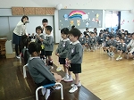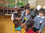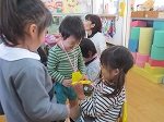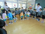 今日は、新入園児歓迎会がありました。おおきい組さんが、歌をうたって聞かせてくれたり、握手をして触れ合って遊んだりしました。おおきい組さんが折り紙で折って作ってくれたひよこのペンダントをプレゼントしてもらって、嬉しそうな新入園児のお友達でした。いろいろな友達とかかわって、