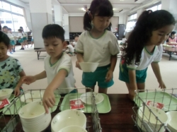 小学生と同じように自分達でおぼんをもっておかずを取りに行き、こぼさないようにそーっと運びます。