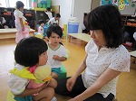 名前を呼ばれると恥ずかしくて、ちらちらと岡田先生を見る子ども達。しばらくすると、だんだん慣れてきて一緒に「ちょつちょつあわわ!」を真似っこして楽しみました。