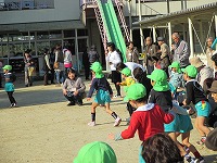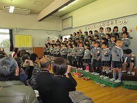ホールではおじいちゃん、おばぁちゃんの前で歌を歌ったり、手遊びをしたりしました。