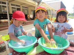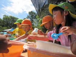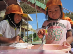 泡や色水でおいしいジュースやデザート作って遊んでいます。