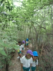 探検の地図を片手に細い山道を進みます。なかなか険しい道もあり、子どもたちも必死です。そんな中、