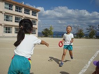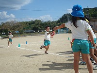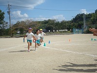 5歳児の子ども達みんなで、赤・青・黄色のチームを決め、広い小学校の運動場で力一杯走り、リレーごっこをしました。