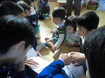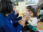 お兄さんお姉さんとわらべ歌遊びをしたり、バスごっこをして遊んだりするうちに、中学生も、幼稚園児もドキドキ感がほぐれ、だんだんリラックスムードで笑顔が見られてきました。