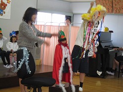大きい組さんは6回、まんなか組さんは5回椅子を回してもらってから、くすだまをわります。