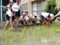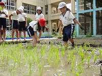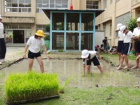 5年生が校内中庭にある小さな田んぼで田植え体験をしました。