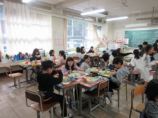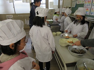 1月9日(木)から給食が始まりました。この日の献立はお正月献立で、ゆかりご飯、牛乳の他に、紅白なます、ごまめ、京風白玉雑煮でした。お雑煮の具材の、正月だいこんやえび芋、白みそは京田辺市で生産されたものです。他にも水菜やだいこん、金時にんじんなどの冬野菜もおいしくいただきました。