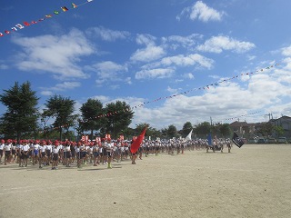 9月19日(木)の2校時に全校練習を行いました。5・6年生のプラカード係を先頭に、全校児童が4色に分かれて整列し、入退場の行進練習や開閉会式の流れの確認、薪エアロビクスやラジオ体操の練習をしました。