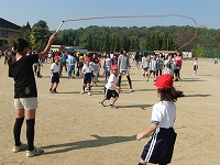 11月2日(水)に11月集会(長縄とび大会)に向け、異年齢集団(アジサイ班)による仲良し給食と、そのあとに昼間休みを使い、練習がありました。