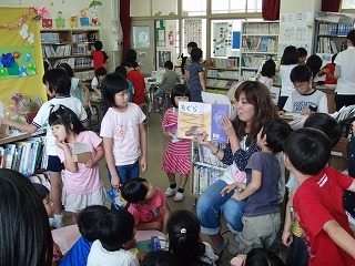 昼休み、図書館で図書館ボランティアのお母さんによる読み聞かせがありました。