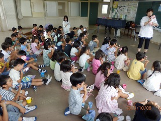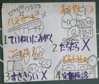 歯科衛生士さんによる歯磨き指導をしていただきました。日常の場面を想定し、①甘い物を控えること。②好き嫌いせずに何でも食べること。③しっかり歯磨きをすること。そして④歯科医での定期検診が大切であることを先生の巧みな話術で、1年生の子ども達は楽しく学びました。その後、実際に磨きしながら歯磨きのポイントを学びました。