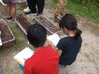 3年生が理科の学習で、春に植えた草花の観察を行いました。子どもたちはマリーゴールドやホウセンカなどがどうなっているか、観察カードに記入しながら、様子を調べました。花はすっかり枯れていましたが、よく見ると種子ができていました。特にマリーゴールドは種子の形も変わっていて、子どもたちも大変驚いた様子でした。まだまだ、暑い日が続きますが、熱中症に注意しながら教育活動を進めていきたいと考えています。