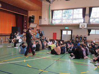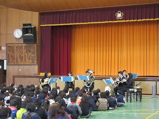 12月13日(金)に「文化芸術による子どもの育成事業」としてPTA文化教養部の方々にお世話になり、5・6年生が音楽鑑賞を行いました。プロフェッショナルブラスアンサンブルの「オルカブラス」の皆様に来ていただき、児童たちが授業で歌った曲やよく知っている曲などの演奏を聞いたり、楽器についてのお話を聞いたりしました。トランペット、チューバ、トロンボーン、ホルン、ドラムなどの楽器の紹介やその音色に耳を傾けていました。低学年、中学年、高学年と3回にわたって児童たちに楽しい音楽を届けてくださったオルカブラスの皆様、そして文化教養部の皆様、ありがとうございました。