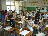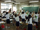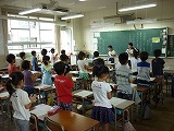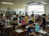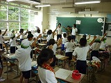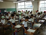 今日(9月8日(月))から朝の応援練習が本格的に始まりました。係活動の『応援団』の子どもたちが自分たちで考えた、コールや応援歌を同じ色の子どもたちに教えに行きました。