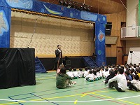 10月26日(金) 2校時目に祖父母参観があり、大勢の皆さんが参観されました。おじいちゃん、おばあちゃんが学校に来るということで、今日は欠席者は0人、授業参観では子ども達は、元気いっぱい手を挙げ、発言をしていました。 その後、体育館で文化鑑賞会がありました。 今年は宮沢賢治の「セロ弾きのゴーシュ]と[注文の多い料理店」のステージでした。 幼稚園児や祖父母参観に来られた皆さんと一緒に、楽しみました。