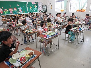 昨日は七夕でした。1年生の教室の前の笹には、一人一人の願いが書かれた短冊が飾られています。また給食の七夕メニューの星形のハンバーグと七夕ゼリーもおいしくいただきました。願い事が叶うといいですね。