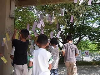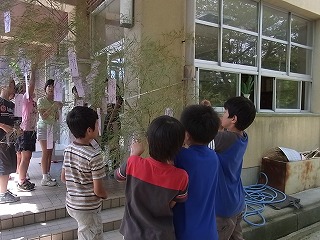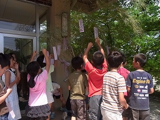 明日は7月7日、七夕の日です。薪小学校では、玄関に竹を置き、願いを込めて短冊を飾りました。
