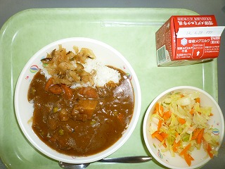 《1年生の給食がはじまったよ》 麦入りごはん 牛乳 ビーフカレー レモンサラダ 福神漬け