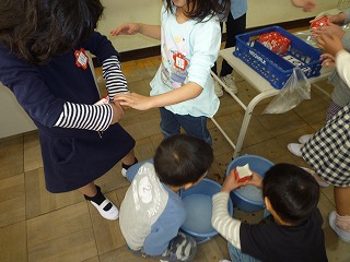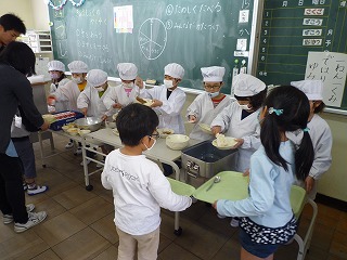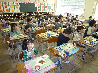 今日から1年生も給食開始です。 ドキドキ、ワクワク初めての給食は、「カレー」ではじまりました。 配膳、後片付け、何もかも初めて。牛乳パックはリサイクルされているため、しっかり洗ってから、きれいに折りたたまなければいけません。 先生に一人一人教えてもらいながら、一生懸命に折りたたんでいました。 「給食のカレーは辛い」と思う1年生の児童もいたようですが、食べている様子を見ていると、みんな、「おいしい」といって食べていました。