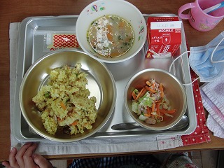 献立メニューは カレーピラフ ツナサラダ コーンスープ 牛乳でした。