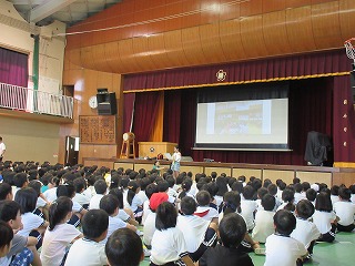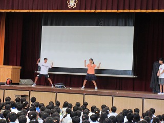 9月10日(水)に児童朝礼を行いました。はじめに運営委員が、7月25日に開催された「夏の地域学校」の活動の様子についての発表をしました。また体育委員は運動会に向けて「薪エアロ」と「ラジオ体操」の見本を発表しました。来週は運動会の全校練習があります。しっかりと体を動かして体操ができるといいですね。