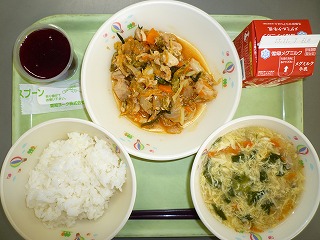 《お誕生日給食》 ごはん 牛乳 ダッカルビ 卵ときのこのスープ 手作りおめでとうゼリー(りんごとカシスのゼリー)