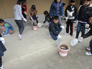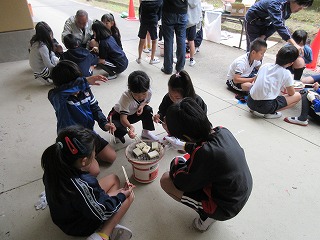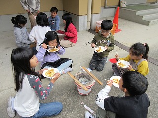 11月22日に3年生が伝統的行事等の体験学習の一環として、七輪で餅を焼く体験をしました。はじめに七輪に新聞紙や小枝、炭を入れて火をおこしました。児童たちは班の友だちと交代して、火が消えないようにうちわで空気を送っていました。七輪でお餅を焼いて食べるのは初めてという児童も多く、焼き立てのお餅をおいしくいただきました。