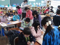 園児達は、教室で2年生と一緒に工作をつくりました。教える2年生も園児を前に、少し