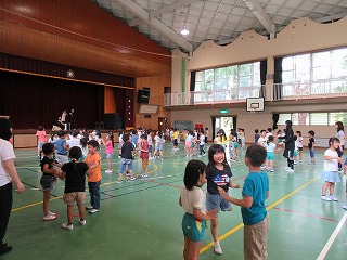 6月6日(木)の昼休みに、薪幼稚園児と1年生が一緒に遊びました。自己紹介をして、1年生からはペンダントをプレゼントをしました。そして一緒にフォークダンスを踊り楽しい時間を過ごしました。次の交流も楽しみですね。