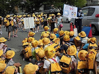 7月21日(火)、1年生を対象に田辺警察署員の方に来ていただき、交通安全指導をしていただきました。今年度は、新型コロナウイルス感染症予防のため交通安全指導教室が開催できていませんでしたが、田辺警察署員の方から横断歩道を渡る時や歩行の際の注意事項について、絵を使って分かりやすく説明していただきました。田辺警察署の皆様、ありがとうございました。