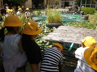1年生の生活科の学習で、学校の観察池の生き物を調べました。薪小学校の中庭にある観察池には、子どもたちが観察した結果、かえるやめだかの生き物がいることが分かりました。暑い日が続きますが、子どもたちはしっかり学習に取り組んでいます。