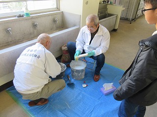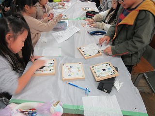 1月20日(月)に京都府職業能力開発協会から、京都府タイル技工協同組合の皆様に来ていただき、3年生がタイルコースター作りに取り組みました。児童たちは、準備していただいた様々な色、形、大きさのタイルの中から選び、自分のデザインを考えて枠に並べました。セメントを塗って水で洗って仕上げていただくマイスターさんの技に児童たちは驚いている様子でした。イメージを膨らませて個性豊かな作品を作り、ものづくりの楽しさを感じることができたのではないでしょうか。