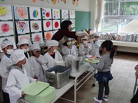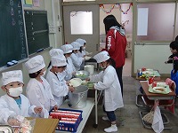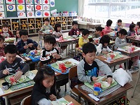 どの学級も、先生からしっかりと配膳等の説明を受け、当番はエプロンを付け身支度