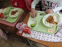 整然と準備ができ、セルフで配膳後、初めての給食を楽しみました。