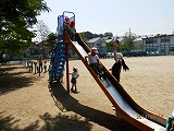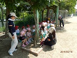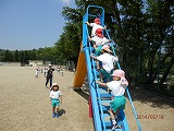 5月16日(金)10時頃、薪幼稚園の可愛い3歳児さんが先生達と一緒に電車ごっこで並んで校庭にやってきました。おやつをいただいたあと、幼稚園にはない大きな滑り台や鉄棒で仲よく遊んで楽しんでいました。昨年度に設置された ”杉ちゃんベンチ” にもゆったりと腰をかけてくつろぎ、楽しいひと時でした。