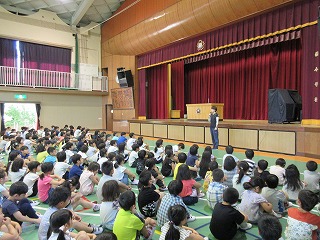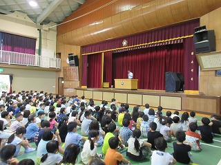 6月3日(月)に全校朝礼を行いました。校長が、まもなく始まる水泳学習のときに気を付けることや命の大切さについて話をしました。また今月の月目標「みんなで仲良く遊ぼう」について担当の先生が話をしました。もうすぐ梅雨の季節が訪れますが、教室でもきまりを守ってみんなが楽しく安全に遊べるようしましょう。