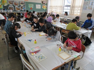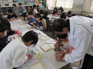 11月14日(木)に、京都府職業能力開発協会から、京都府タイル技工協同組合の皆様に来ていただき2年生がタイルコースターを作りに取り組みました。児童たちは自分の作りたいコースターをイメージして様々な色、形、大きさのタイルを選んで、個性あふれるタイルコースターを作り上げていました。