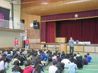11月15日(金)に京田辺市社会福祉協議会の方々に来ていただき、視覚障害についての福祉学習を行いました。駅のホームで、目の不自由な方々が安心して使えるような工夫について話を聞いたり、実際に点字に触れたりしました。また2人1組になり、アイマスクを着用して誘導の体験をし、歩く速さや歩幅など目の不自由な人を誘導するときに気を付けることなどを学びました。