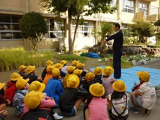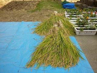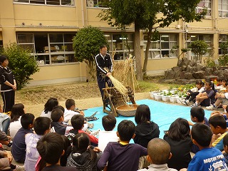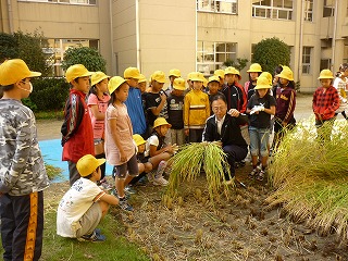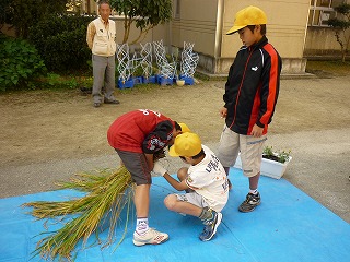 6月に植えた稲が成長し、5年生が稲刈りと脱穀をしました。