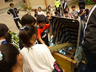 脱穀は、昔の足こぎ脱穀機を使い、グループごとに行いました。みんな初めての体験で楽しそうでした。