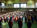 今日の児童朝礼ではいつもの『児童会の歌』に引き続き、6年生を送る会で全校合唱する『大空がむかえる朝』の練習を行いました。