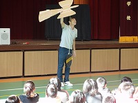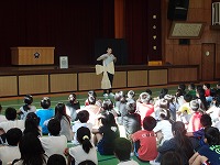 配られた‘けん玉’について、自称けん玉名人のK先生から、全校児童に