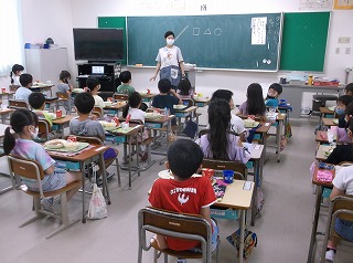 7月31日(金)この日は、1学期最後の給食となりました。1年生の教室では、新型コロナウイルス感染症拡大予防のため、子ども達は新生活様式を守りながら、おいしそうに給食をいただきました。この日のメニューは牛乳、ハヤシライス、フルーツポンチです。なお、2学期は8月26日(水)から給食開始の予定です。